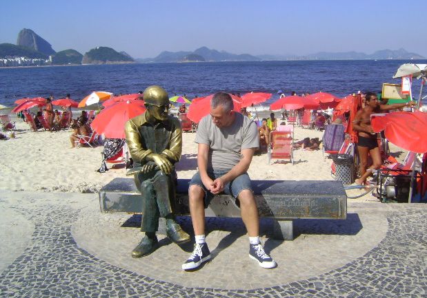 De volta ao Rio, desembarcamos e, outra vez, deixamos as malas num guarda-volumes. Queríamos ver de novo a praia e fomos de ônibus para Copacabana. Lá caminhamos na areia, molhamos os pés no mar, tiramos fotos e fomos almoçar uma comida de verdade, o que não fizemos a viagem toda: feijão, arroz, bife, fritas e uma cerveja bem gelada de garrafa. Nesse pequeno restaurante de esquina onde fizemos nossa refeição, conhecemos um senhor norueguês de 75 anos, cujo nome é Neils (e, Neils, perdemos teu e-mail, mas se por um milagre leres isto, fica sabendo que foi um prazer todo o papo que tivemos). Conversamos em português, inglês e, quando não conseguíamos nos entender nem numa língua nem em outra, sorríamos e tudo se resolvia.